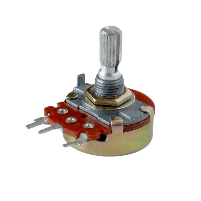 Potenciómetro de 1MΩ ajustable, utilizado para el control de voltaje, ajuste de ganancia y calibración en circuitos electrónicos. Disponible en versiones lineal (B) y logarítmica (A).