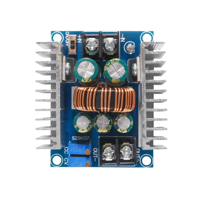 Módulo convertidor reductor DC-DC (buck) de alta potencia, basado en el controlador LM25116 de Texas Instruments. Diseñado para ofrecer gran eficiencia y estabilidad, este módulo permite reducir voltajes desde 40 V hasta niveles tan bajos como 1.2 V, entregando corrientes de hasta 20 A y una potencia total de 300 W. Ideal para aplicaciones donde se requiere fuente ajustable de alta corriente o carga de baterías de gran capacidad.