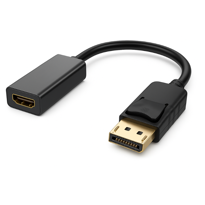 Adaptador DisplayPort a HDMI, diseñado para convertir señal de video digital desde una salida DisplayPort hacia una entrada HDMI. Ideal para conectar computadores, laptops o tarjetas gráficas a monitores, televisores o proyectores con entrada HDMI, manteniendo alta calidad de imagen y transmisión estable.