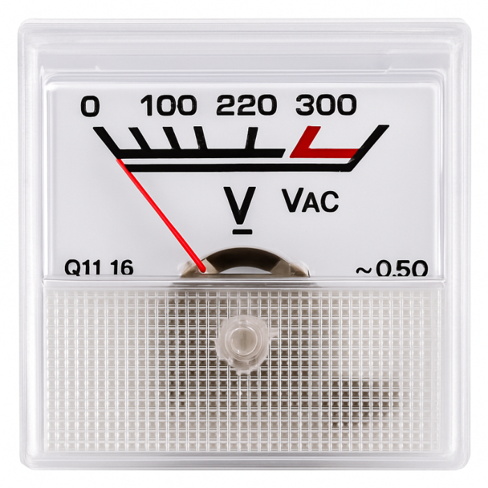 Instrumento de medición analógico diseñado para el monitoreo visual de tensión en corriente alterna. Su formato de panel cuadrado permite una integración estética y funcional en tableros de control, plantas eléctricas o proyectos industriales. Cuenta con una escala clara de fácil lectura y una zona de advertencia resaltada en color rojo para identificar sobretensiones de forma inmediata.